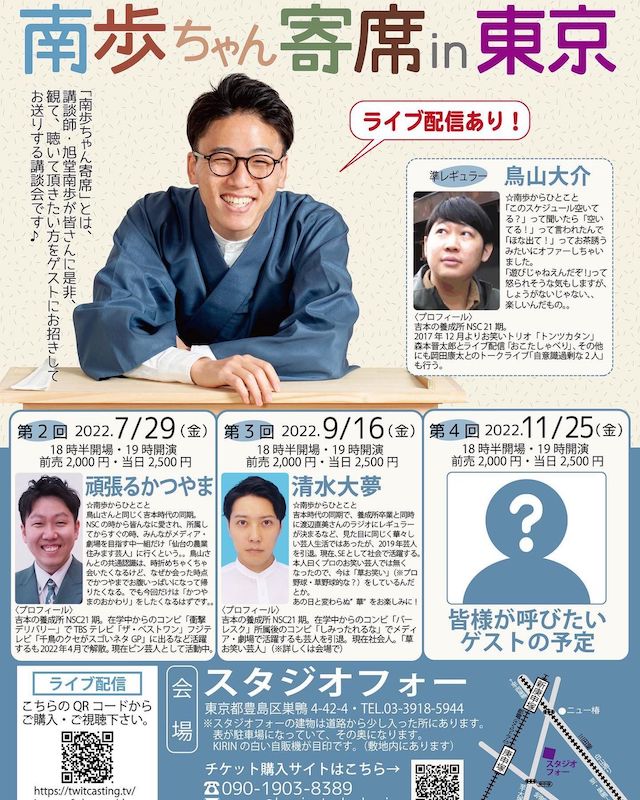 今回のお目当ては上方の若手講談師旭堂南歩だ。1991年10月生まれの30才。2019年に旭堂南三衛門に弟子入りして3年目の若手である。贔屓の神田松之丞が真打に昇進して神田伯山となり、成金の二ツ目落語家たちが次々と真打に昇進した。桂宮治にいたってはテレビ番組「笑点」のレギュラーになってしまった。