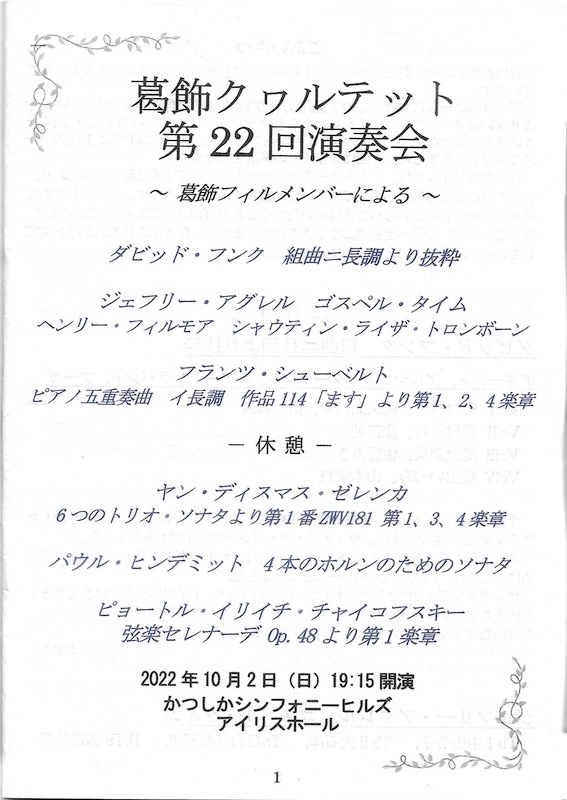 シューベルトの「ます」は前半のハイライトであった。ヴァイオリン、ビオラ、チェロ、コントラバス、プラスピアノによる一糸乱れぬ演奏はこれぞ小編成のクラシック音楽と言えるものであった。