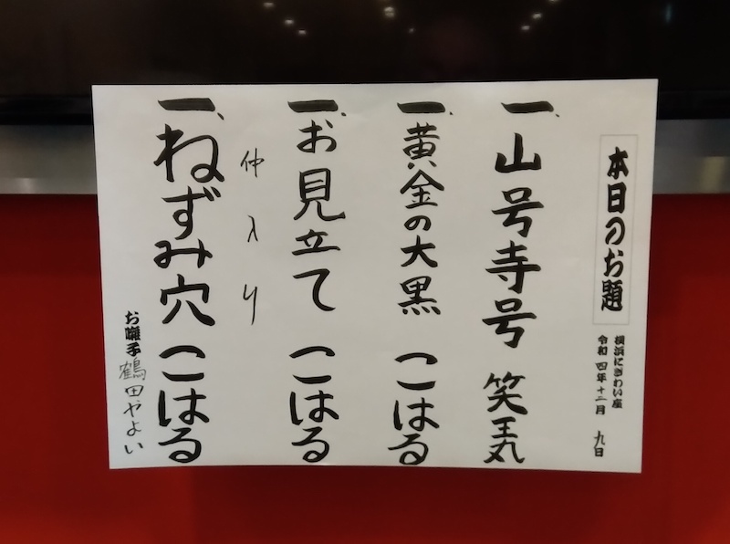 「黄金の大黒」は孫が黄金の大黒を土の中から掘り出した記念に、大家さんが長屋の店子たちにご馳走を振舞うという噺。真打昇進祝いにふさわしい噺である。