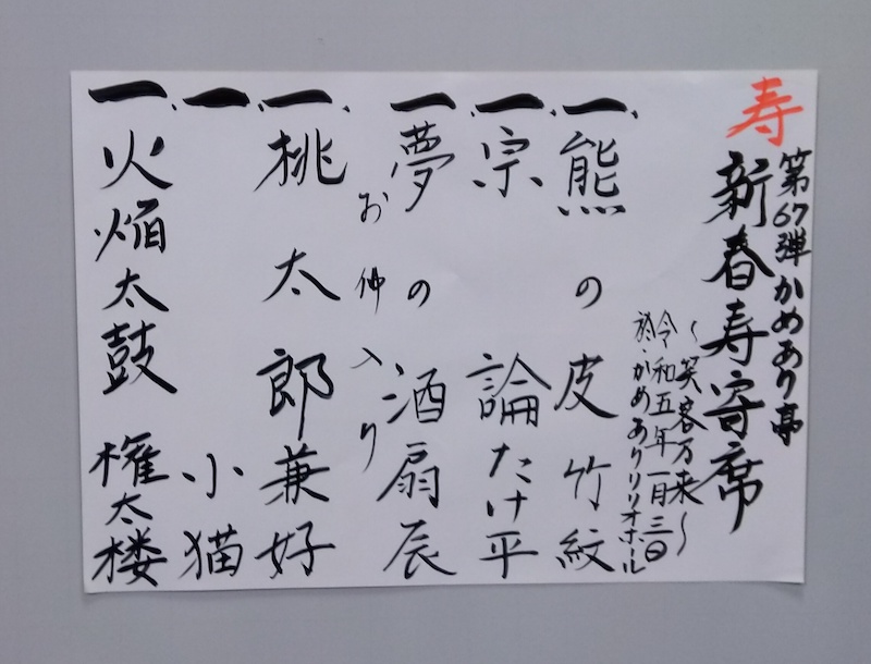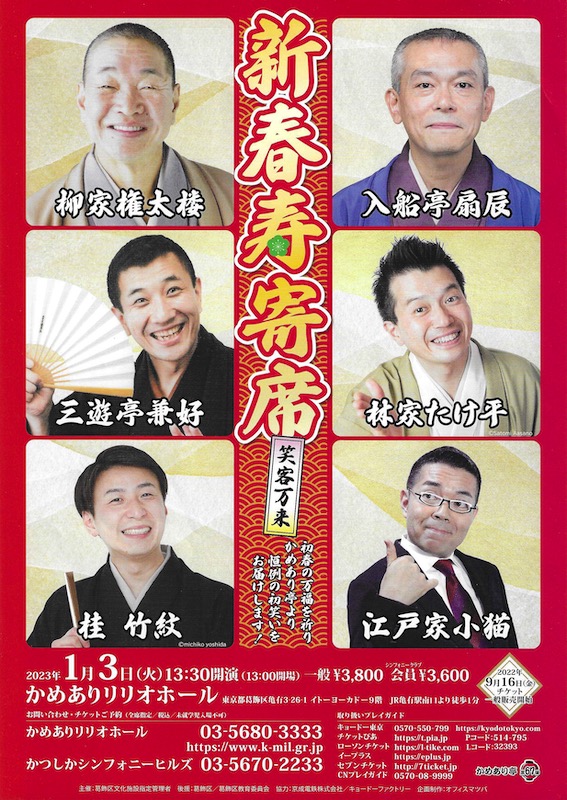 トリは柳家権太楼師匠で「火焔太鼓」。お正月のトリにふさわしい噺である。がさつであるが仲の良い夫婦の会話が迫力満点であった。