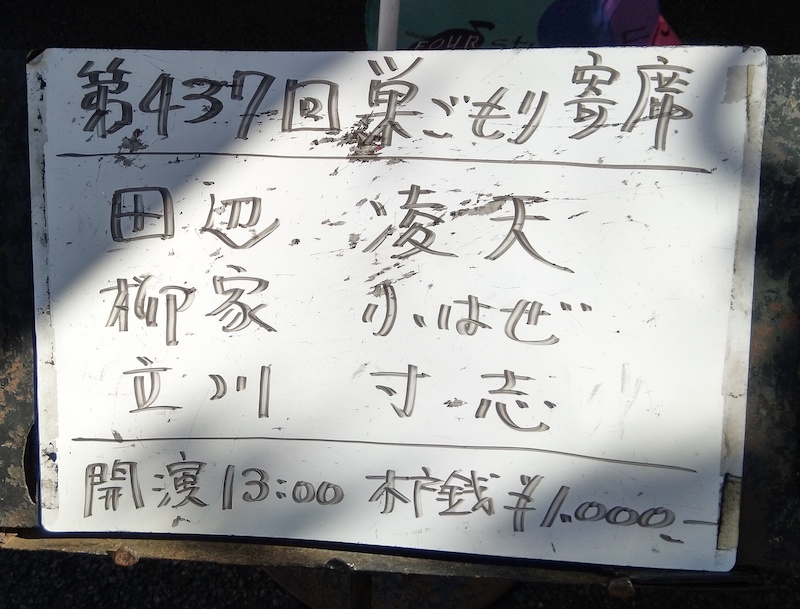 彼女は講談独特の節をつけて張り上げるタイプの講釈師である。節をつけて張り上げるのは良いが、そればかりだと単調になってしまう。子守唄のように。「紅緒の草履」という話が芝居話であるところまではわかったが、そのあとこの話がどういう話だったのか思い出せない。