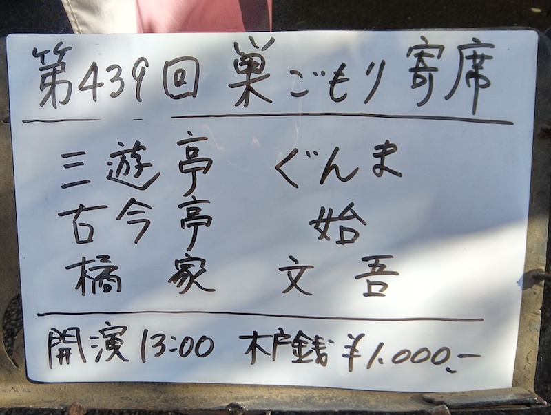 入り口の番組表を見ると予定の出演者と違っている。桂優々と立川かしめの代わりに古今亭始と橘家文吾となっている。三遊亭ぐんまのみ予定通りとなっていてひと安心した。今日のお目当てはぐんまだからだ。