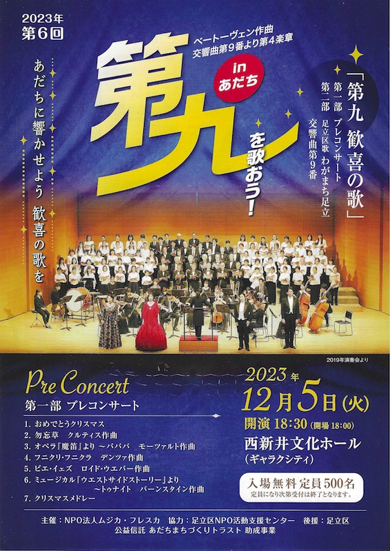 第二部は足立区歌「わがまち足立」のあと、ベートーヴェンの交響曲第九番の第4楽章「歓喜の歌」。コントラバスによる出だしのメロディを聴くといつもワクワクする。今回は最小限のオーケストラで、各パートの楽器が一つか二つしかない。器楽奏者の応募者が少なかったのだろう。