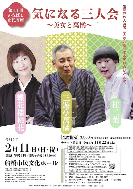 ところで本会の副題「美女と萬橘」は出演者たちには不評だった。「気になる三人」なのだから、三人とも同じ価値であると思うが、二葉と桃花は「美女」のひとくくりで個性を帳消しにされ、萬橘は野獣扱いされた。誰でも「美女と」がくれば「野獣」と受けたくなるだろう。しかも「美女」はセクハラにつながる。二葉さんがまくらで言っていたように、主催者側の無神経なおじさんが2分くらいで考えだした副題だったのだろう。