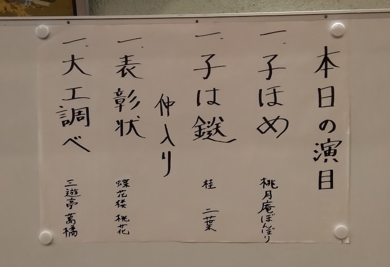 仲入りの後は、林家木久扇のあと笑点入りが確実といわれている蝶花楼桃花。出し物は新作の「表彰状」。