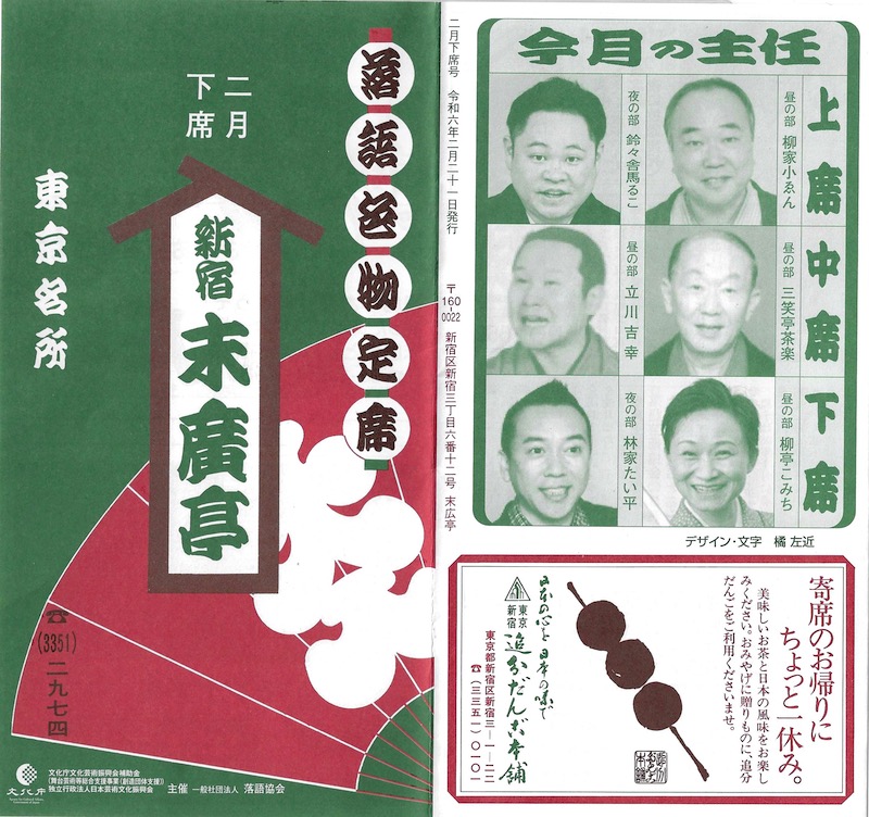 立花家橘之助は浮世節で三味線の弾き語り。昔の師匠たちの出囃子を弾いて見せたが、古今亭志ん生、柳家小さんなど、今では聴けないメロディで懐かしかった。15分。古今亭志ん輔は「紙入れ」で15分。