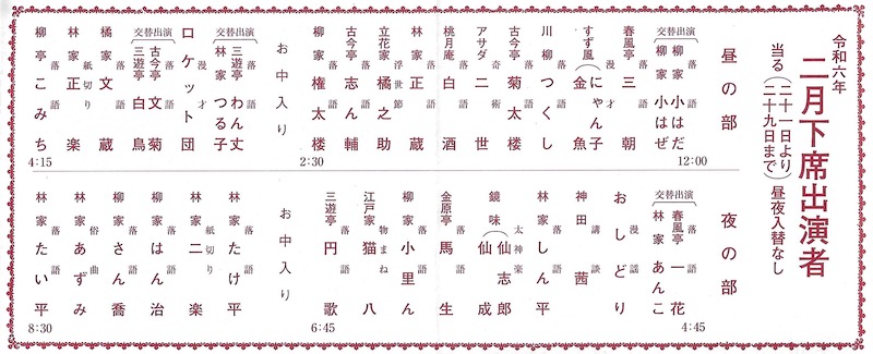 開口一番の林家十八は昼の部開始時間の10分前に登場。「金明竹」をサラッとやって引き下がった。