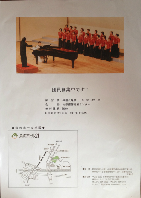 会場の予約からパンフレット作り、設営、受付に至るまですべて自分たちで行う手作りのコンサートだ。入場料は無料、なるべく多くの人に自分たちの歌声を聴いてほしい。 主婦が主体の団員たちは週に1回先生の家に集まる。練習は厳しいが皆楽しんでいる。 今回は9年ぶりのコンサートだ。前回もこの会場でやった。前回以上の観客に来てほしい。皆家族や親せきや知り合いに整理券を配りまくった。