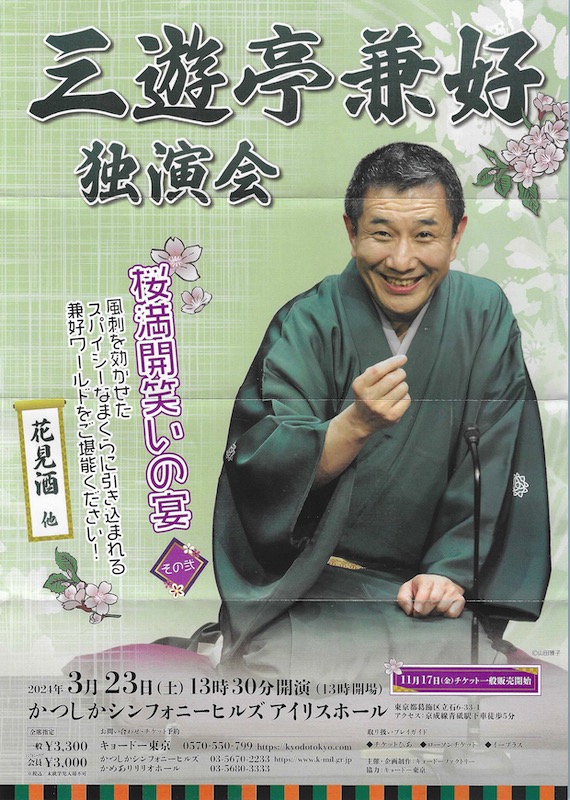 次は今日の会で唯一決まっていた演目「花見酒」。桜の季節にちょうど良い噺である。長期予報だと桜が開花している時期だったが、残念ながら寒の戻りで肌寒く、まだ咲いていない。