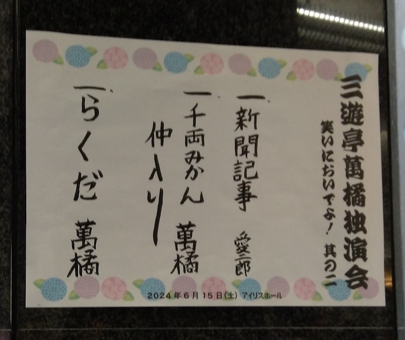 今日の萬橘は長いまくらの後、「千両みかん」に入っていった。まさに今の季節の噺である。今はきゅうりとトマトとナスの季節。萬橘は緑色の手拭いを絞ってきゅうりに見立て、噺をうまく展開していた。