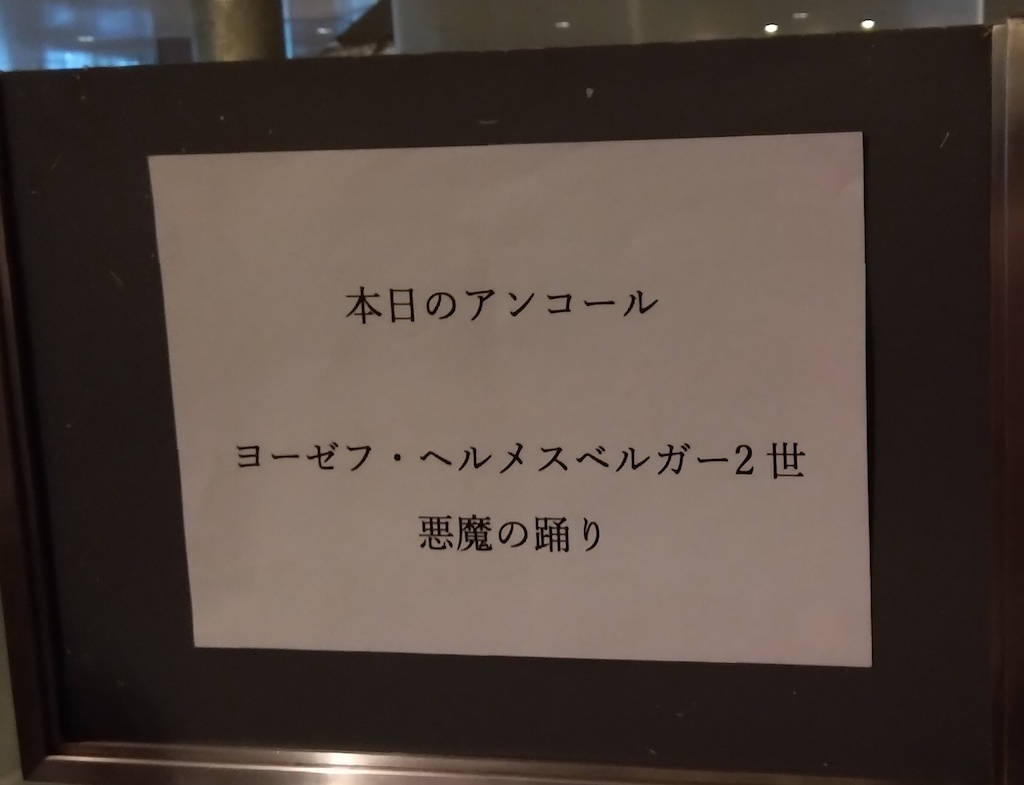 アンコールは、オーストリア出身のヴァイオリニスト、作曲家、指揮者のヨーゼフ・ヘルメスベルガー2世の「悪魔の踊り」。これはアンコールにふさわしく華やかでリズミカルな曲であった。