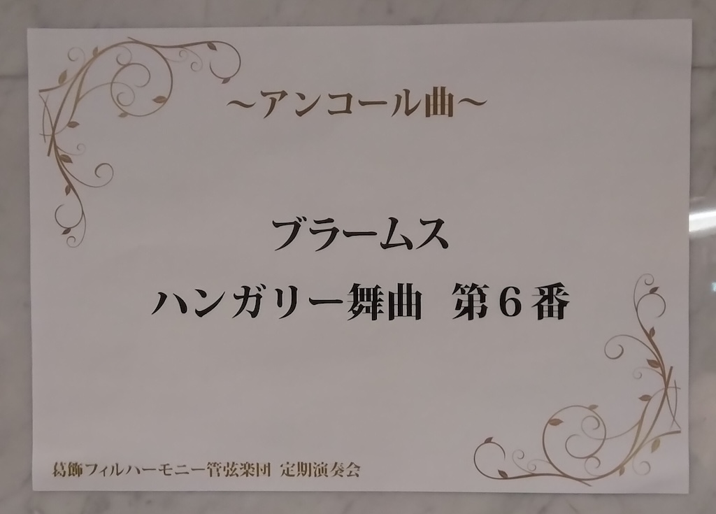 アンコールはブラームスの「ハンガリー舞曲 第6番」。華やかな曲で、アンコールにふさわしい。ブラームスのハンガリー舞曲はどれを選んでもアンコールにふさわしい曲ばかりである。