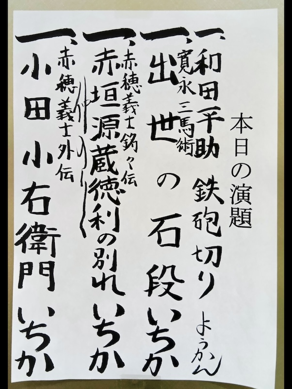 次の読み物は「赤穂義士銘銘伝 赤垣源蔵徳利の別れ」。討ち入り前夜、兄のところに別れの挨拶に来たが、兄は留守。赤垣源蔵は兄の羽織を相手に酒を酌み交わす。 仲入り後は「赤穂義士外伝 小田小右衛門」。細川家にあずけられた大石内蔵助をはじめとする義士たちは元禄15年2月4日、処刑の日を迎える。介錯に選ばれたのは徒歩組の小田小右衛門。大石に身分を聞かれた小右衛門は、大石に恥をかかせまいとして500石取りの見廻組と偽る。 翌元禄16年、高輪の泉岳寺に見廻組の衣装を着た小田小右衛門が現れた。訳を聞いた細川の殿様は・・・。 赤穂義士の挿話は講談ネタの宝庫である。冬は義士、夏はお化けで飯を食い、という言葉があるほどである。聴き終えて、いい話を聞いたなー、と思えるのが義士伝の特徴である。今日も会場から外に出たら寒風が首筋を撫でてゆく。それでも心の中は暖かいのである。 |