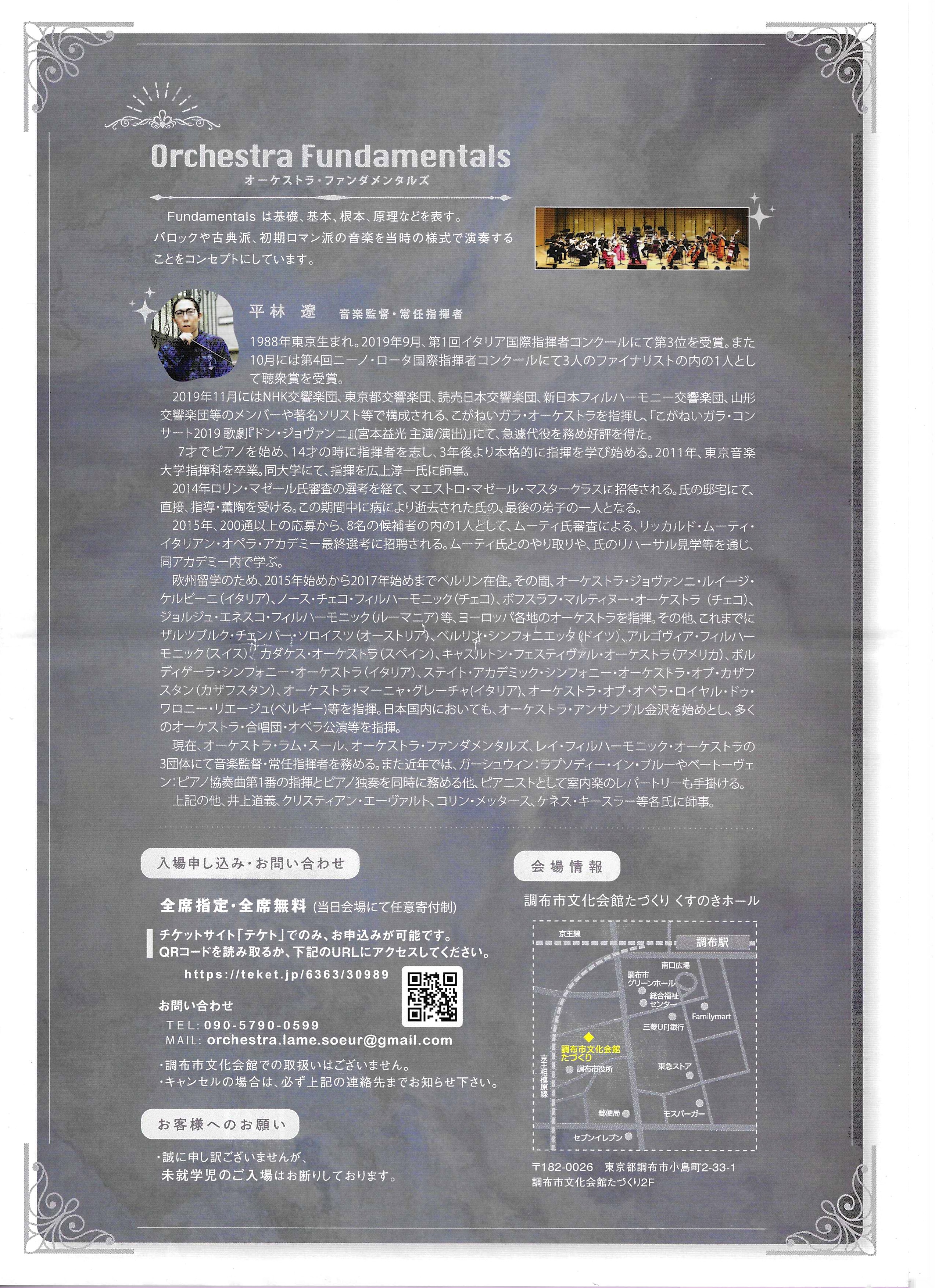調布市のくすのきホールは座席数500ほどの中規模のホールであった。オーケストラ・ファンダメンタルズはオーケストラとしては最小人数の楽団であったため、このホールの容量にあっていた。