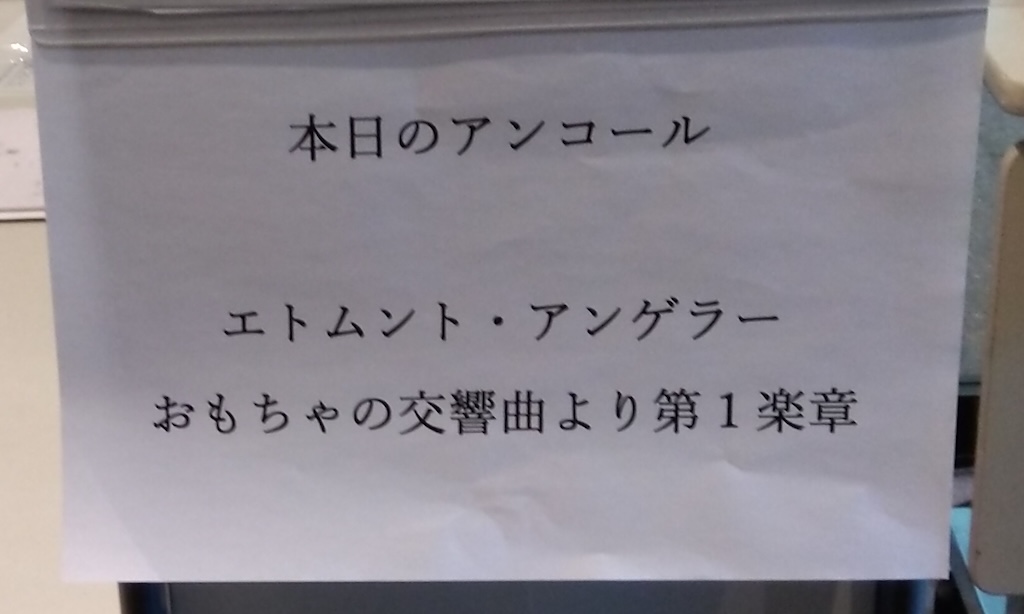 アンコールのおもちゃの交響曲「第1楽章」はおもちゃの太鼓や鳥笛などの鳴物がはいった楽しい曲であった。