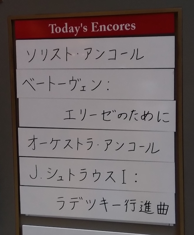 アンコールはヨハン・シュトラウスI世の「ラデツキー行進曲」。ニューイヤーコンサートの締めはやはりこの曲でなければ。盛大な手拍子と共に始まった。