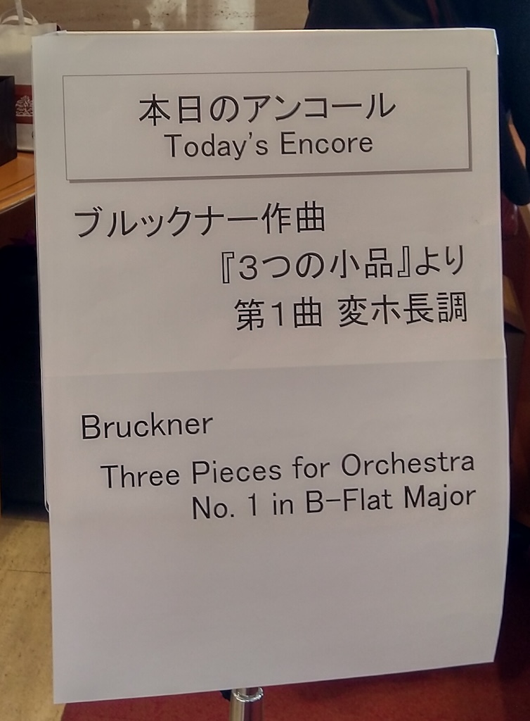 アンコールはブルックナーの曲でこれは日本で演奏されるのはかなり珍しい、と指揮者の坂入氏が言っていた。