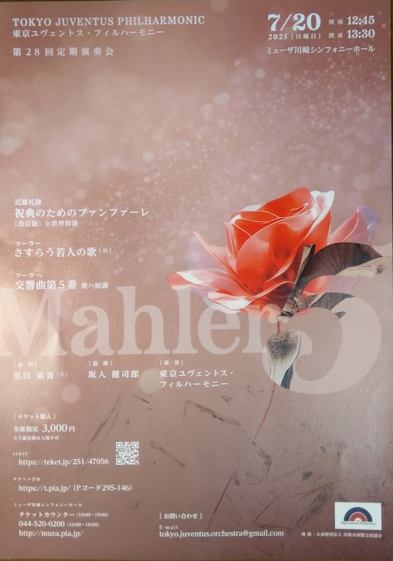 「交響曲第5番 嬰ハ短調」。第一楽章のトランペットによるファンファーレとそれに続く4本のトロンボーンの響きはきらびやかで、これから始まる音楽に対する期待感を高めた。マーラー特有のスラブ風のうら淋しいようなメロディは、胸の内側を羽でくすぐるような感覚におちいらせる。 第三楽章では6本のホルンの響きは第一楽章のトランペットをしのぐほどのきらびやかな迫力があった。