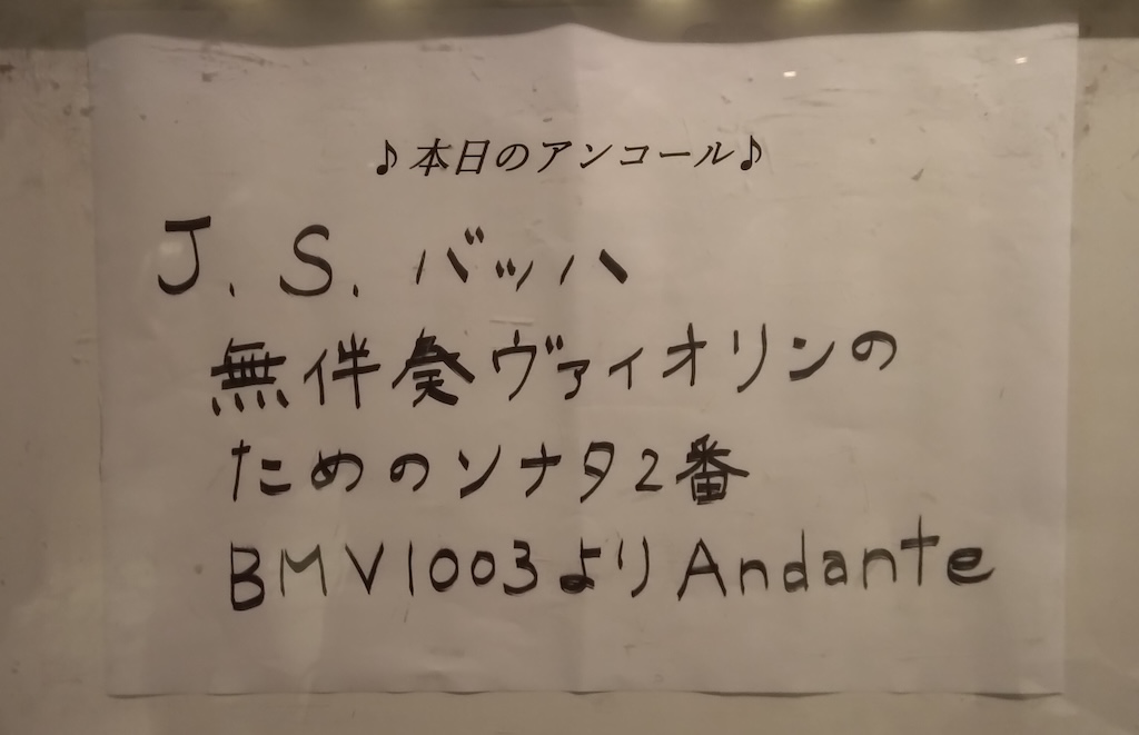 アンコールはバッハの「無伴奏ヴァイオリンのためのソナタ2番」。これは曲も演奏も良かった。バッハは偉大である。