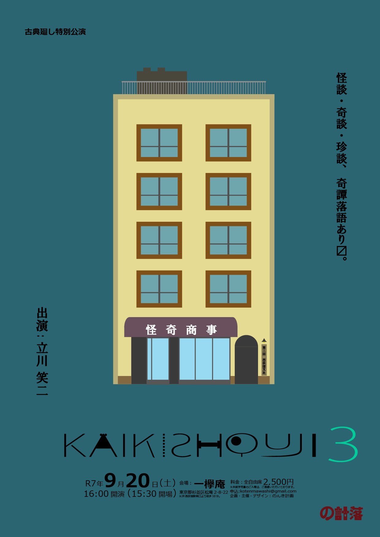 今日の西荻窪は傘をさすか、ささなくてもいいか、迷うような小糠雨が半日降っていた。一欅庵の中庭は5時過ぎたら薄暗くなっていた。庭木がうっそうと繁り、そこに雨。「怪奇商事3」という表題にぴったりの舞台装置になっていた。