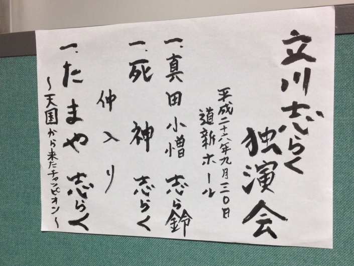 どちらかというと滑稽噺の得意な志らくだがこのテーマをこういうプランで演ろう、という思いに滑稽噺とか人情噺とか新作落語とかいうジャンルを超越した迫力を感じた。