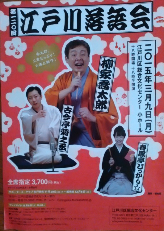 喬太郎の「稲葉さんの大冒険」では笑った。涙が出るほど笑った。前後左右の観客たちも大笑いしていた。「なんてばかばかしい」とか「めちゃくちゃだなあ」とか言いながら。 謹厳実直なサラリーマンがある日の帰宅途中何気なく受け取ってしまったポケットティッシュのために松の大木を背負って帰ることになる顛末、なんでこうなるの…? という感じだ。