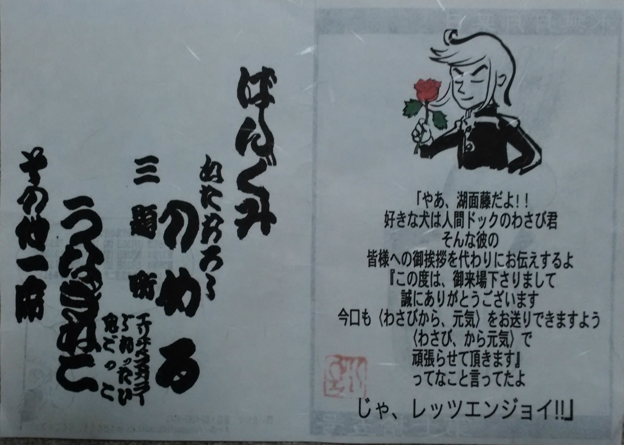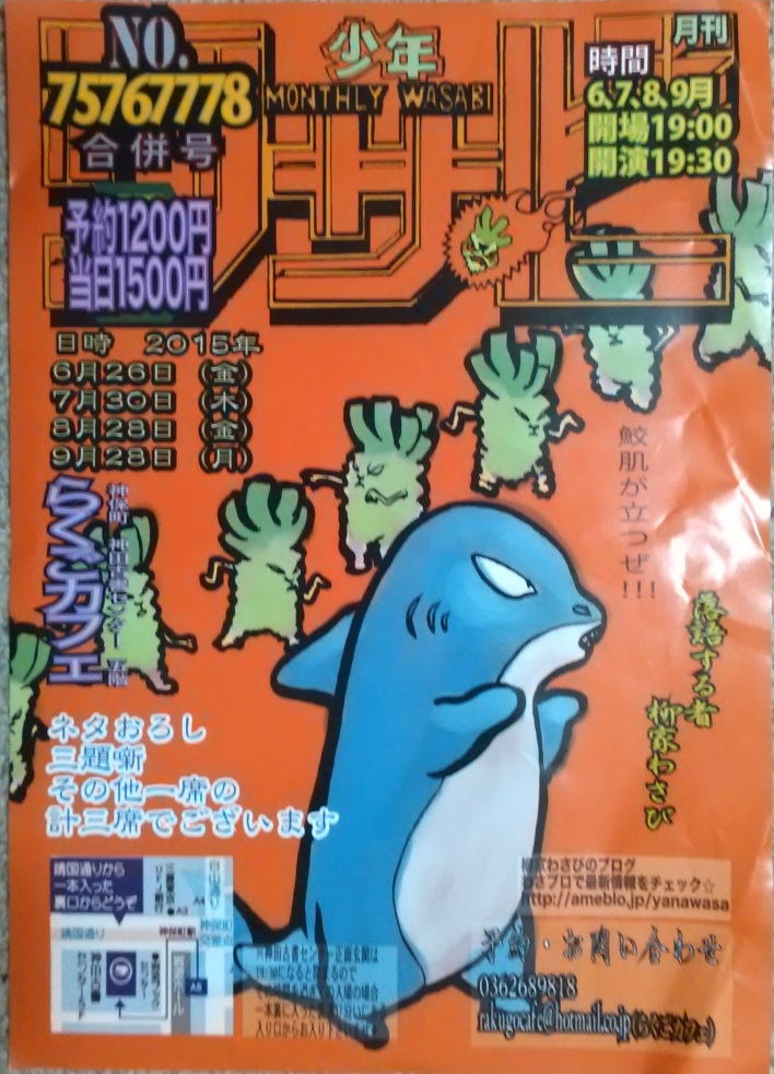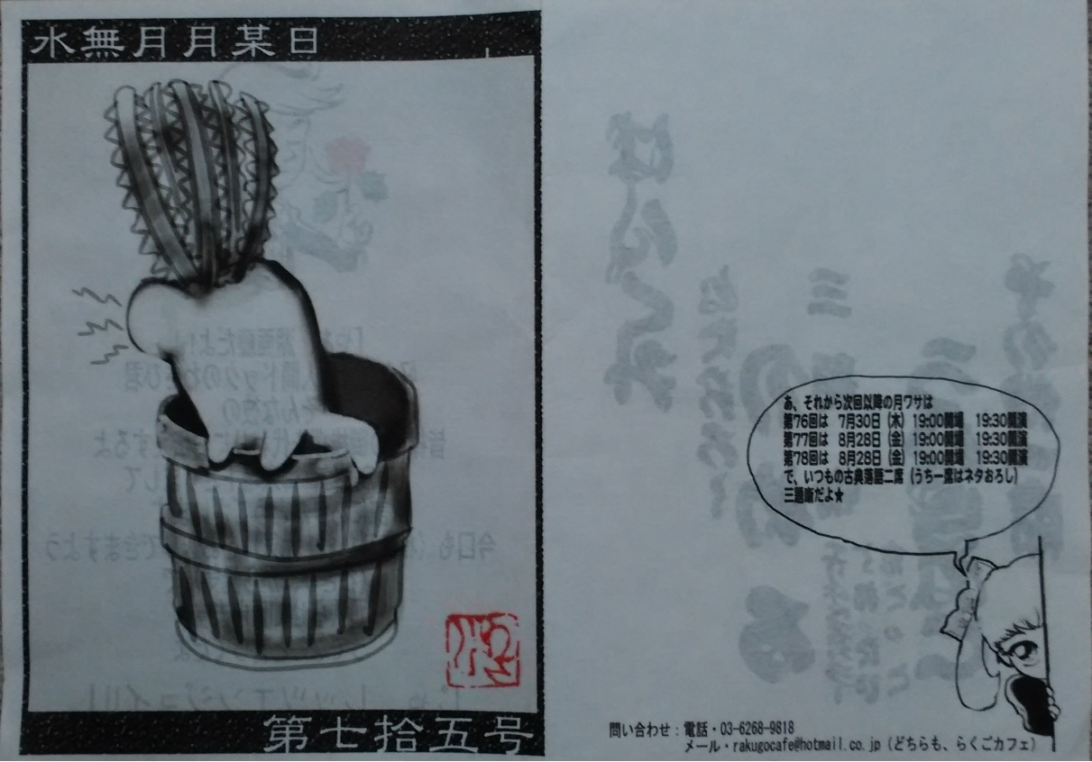 ちらしも番組表もわさびの手製。番組表の表紙は大根が醤油樽に入りきらないところ。今日の噺に関係のある絵だ。