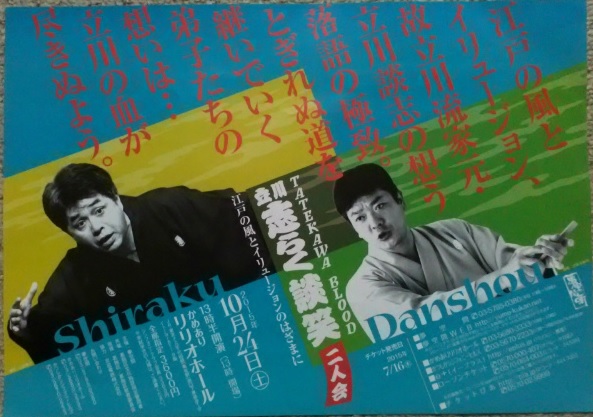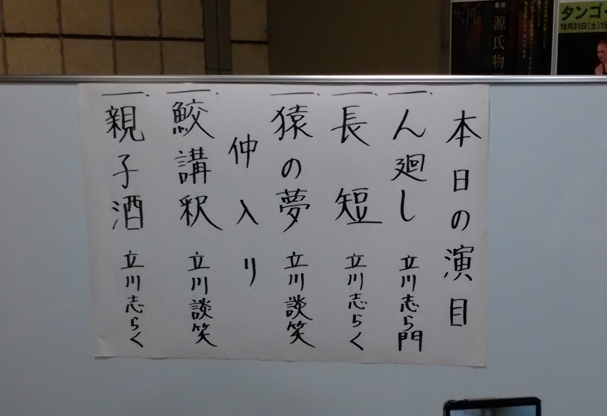 談笑の「鮫講釈」というのは初めて聴く古典落語だった。講談の部分が調子よくパンパンと進み、何を言っているのかわからないが有名な演目のさわりだけを立て続けに演るところが要のようだ。変わり種の滑稽噺だ。ネットで調べると談志とか談春が演っている。立川一門ではよくかけられている演目かもしれない。