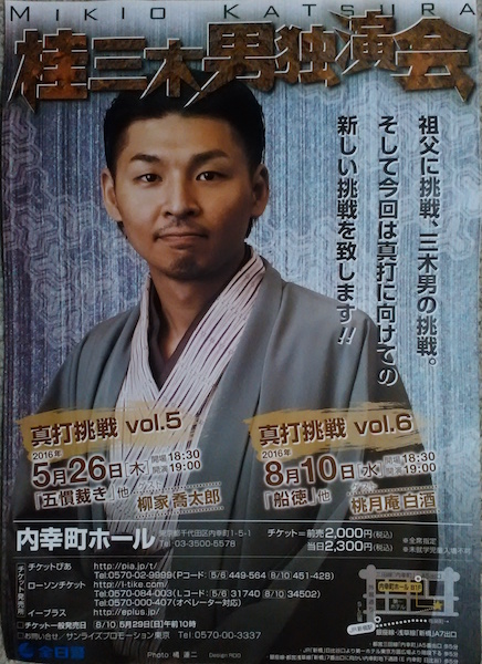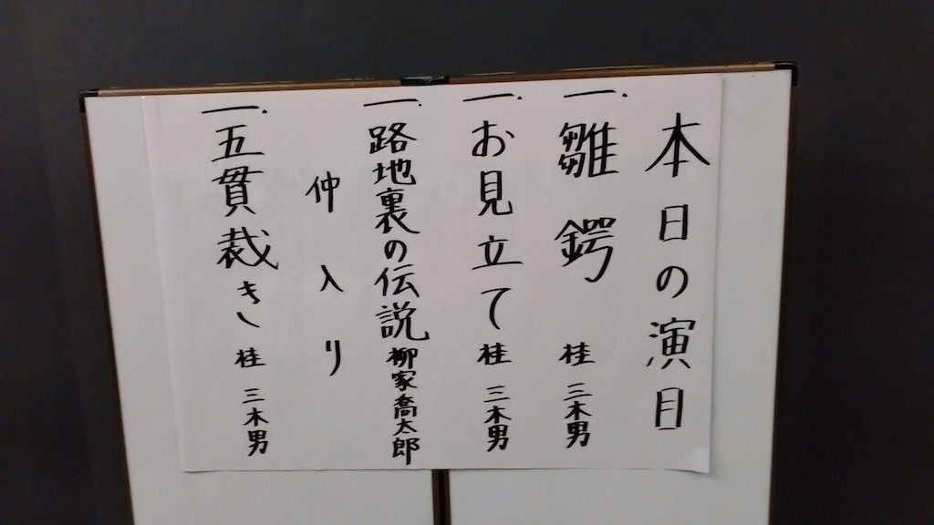 会場を出るとき着物を着た中年の女性と老年の女性が丁寧にお辞儀をしていた。三代目三木助夫人とその娘(=三木男の母親)だ。三木男が固かった原因はこれか。名人の未亡人とその娘の前で自由奔放にやれと言っても無理だろう。