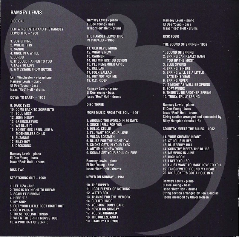 【CDに採り上げられた ![]() LEM WINCHESTER and ![]() DOWN TO EARTH ![]() STRETCHING OUT ![]() RAMSEY LEWIS TRIO ![]() NEVER ON SUNDAY ![]() COUNTRY MEETS ![]() RAMSEY LEWIS AND HIS ![]() RAMSEY LEWIS AND HIS ![]() THE COLORFUL STRINGS ![]() AN HOUR WITH THE ![]() EARLY IN THE MORNING ![]() SOUND OF CHRISTMAS ![]() BOSSA NOVA (画像不明 :" The Sound of Spring " " more music from the soil " " MAX " ) |