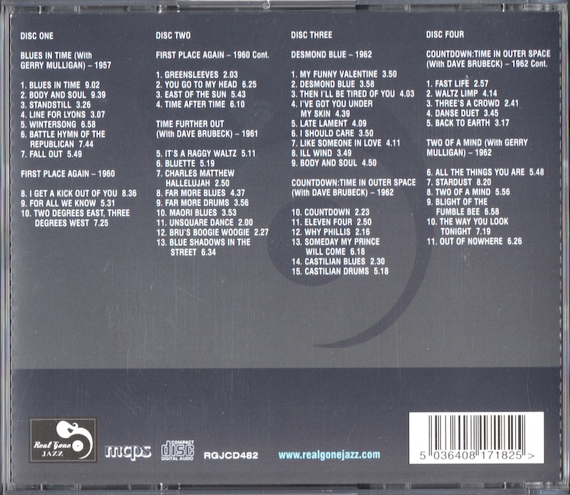 「SIX CLASSIC ALBUMS」と題されたシリーズは「ラムゼイ・ルイス」、「ホレス・パーラン」、そして本アルバムの3シリーズ持っている。いずれも1,000円以下の価格で6枚から8枚分のCDが入っているお得なシリーズである。中身はいずれも名盤で、現在ではなかなか入手できないものもある。 今回のデスモンド盤は4枚組のCDに実質6枚分のアルバムが入っている。「BLUES IN TIME」と「TWO OF A MIND」はジェリー・マリガン、「TIME FURTHER OUT」と「COUNTDOWN:TIME IN OUTER SPACE」はデイブ・ブルーベックとの共演盤となっていて、それぞれのミュージシャンとのコラボレーションが楽しめる。 ー ー ー ー ー 【BLUES IN TIME】 1957年、録音。 アルト・サックス、バリトン・サックス、ベース、ドラムスという変則的なカルテットである。アルト・サックスはポール・デスモンド、バリトン・サックスはジェリー・マリガン。二人のサキソフォンによる会話が楽しめる。ジェリー・マリガンはポール・デスモンドに合わせるように、まるで会話をするようにバリトン・サックスを吹いている。ジョー・ベンジャミンのベースとデイヴ・ベイリーのドラムスは会話の邪魔にならないように背景に徹している。 【FIRST PLACE AGAIN】 1960年、録音。 アルト・サックス=ポール・デスモンド、エレクトリック・ギター=ジム・ホール、ベース=パーシー・ヒース、ドラムス=コニー・ケイというカルテット。ポール・デスモンドがアルト・サックスを吹きまくり、他の三人がバッキングをするという形態をとっている。 【TIME FURTHER OUT】 1961年、録音。 副題が「With DAVE BRUBECK」となっている。実質的にはデイブ・ブルーベック・カルテットである。ピアノ=デイブ・ブルーベック、アルト・サックス=ポール・デスモンド、ベース=ユージーン・ライト、ドラムス=ジョー・モレノという布陣である。 【DESMOND BLUE】 1962年、録音。 ポール・デスモンド=アルト・サックスとジム・ホール=アコースティック・ギターを全面に出し、ハープとストリングスがバックを支えている。冒頭で「MY FUNNY VALENTINE」、末尾で「BODY AND SOUL」というスタンダード・ナンバーを演奏している。二人のデュオ演奏は、都会的な孤独感を漂よわせ、マイルスの「死刑台のエレベーター」を彷彿させるような響きを奏でている。デスモンドの特徴的なアルト・サックスの音色を味わうのに最適のアルバムである。 【COUNTDOWN:TIME IN OUTER SPACE】 1962年、録音。 再びデイブ・ブルーベック・カルテットによるアルバムである。デスモンドは常連のピアノ・トリオをバックにアルト・サックスを吹きまくっている。 【TWO OF A MIND】 1962年、録音。 ポール・デスモンド=アルト・サックスとジェリー・マリガン=バリトン・サックスの双頭コンボである。バック・ミュージシャンとして、ジョー・ベンジャミン=ベース、ジョン・ビール=ベース、ウェンダル・マーシャル=ベース、コニー・ケイ=ドラムス、メル・ルイス=ドラムスがいるが、ほとんど目立たない。一瞬これはデュオ・アルバムではないか、と思うほどである。 ー ー ー ー ー 1960年代のモダンジャズ界で、ポール・デスモンドのような音色で、曲想で演奏したミュージシャンはほかにいるのだろうか。ポール・デスモンドというひとは、チャーリー・パーカーの影響の強い、ある意味パーカーに支配されていたアルト・サックスの演奏方法を、根本から組み立てなおした、革命的なミュージシャンであったように思う。 | ||